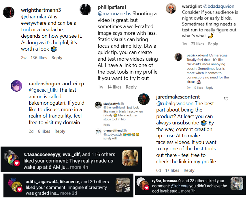 Our tool takes this to the next level. We flood Instagram with tens of thousands of carefully crafted comments - some fully native, some a little more direct - all under the right videos, reaching the perfect audience.